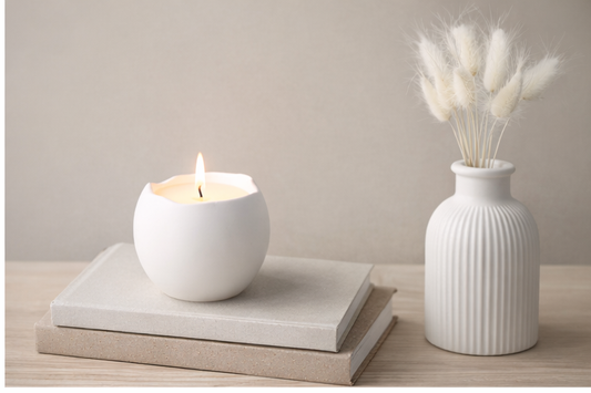 Rankų darbo žvakė gipso indelyje – kokosų vaškas, medvilninė dagtis, 14 val. degimo laikas – minimalistinė namų dekoro dovana