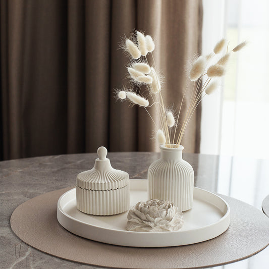 Dovanų rinkinys - Kvepianti žvakė su dideliu padėklu, vaza ir bijūno žiedu – elegantiškas rankų darbo baltas gipso namų dekoras
