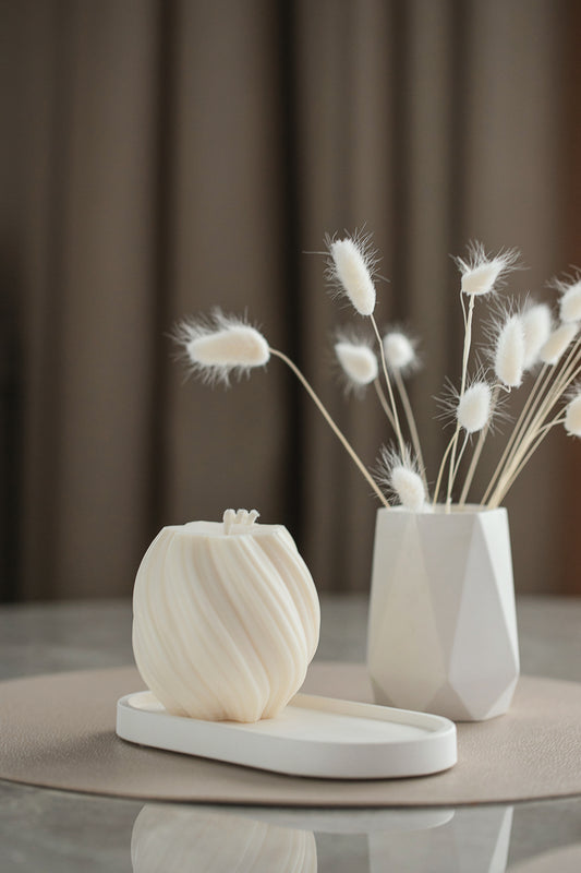 Didelis dovanų rinkinys – dvi kvepiančios sūkurinės žvakės su padėkliuku ir deimanto formos vaza, elegantiškas gipso namų dekoras
