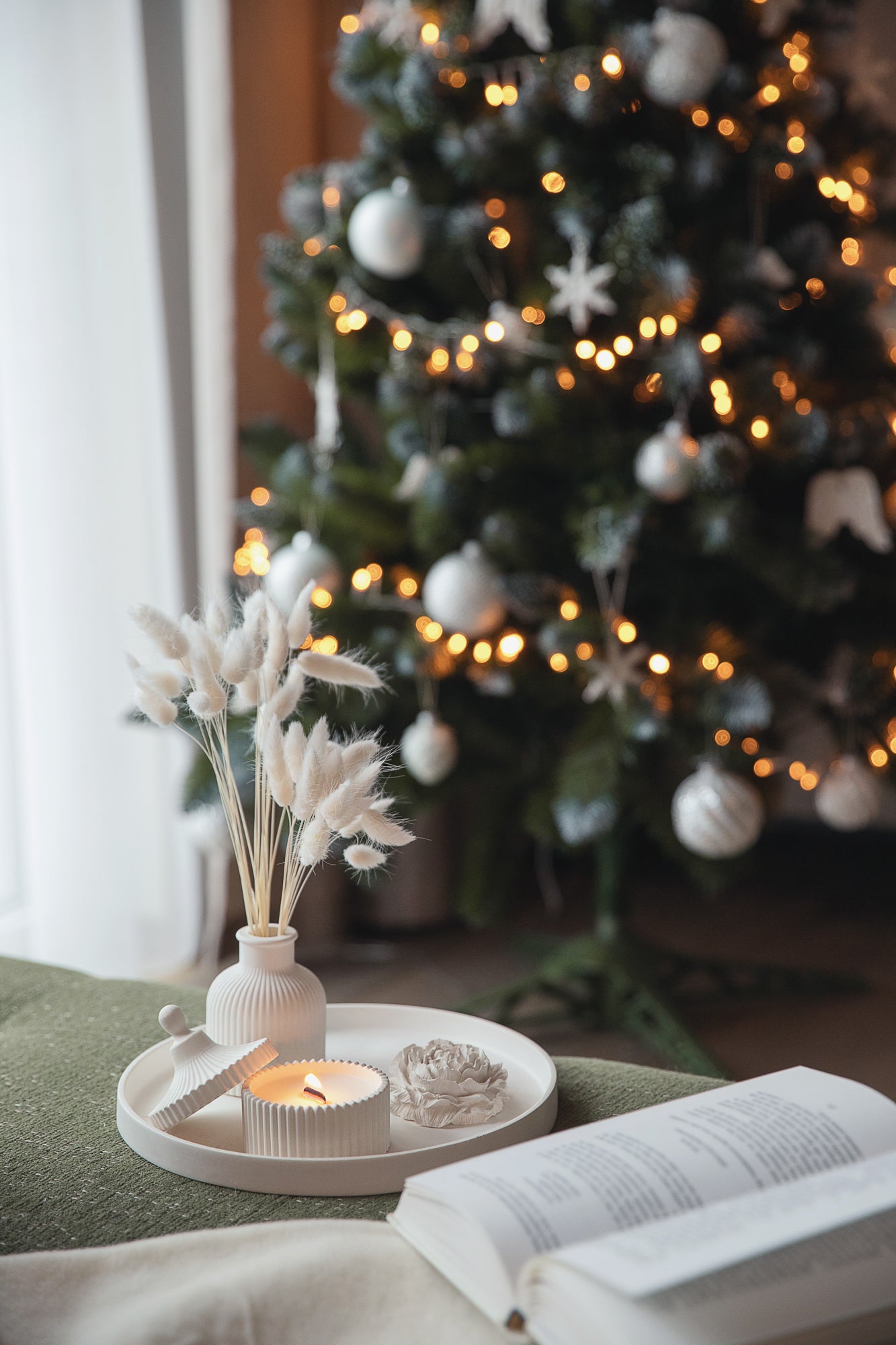 Dovanų rinkinys - Kvepianti žvakė su dideliu padėklu, vaza ir bijūno žiedu – elegantiškas rankų darbo baltas gipso namų dekoras