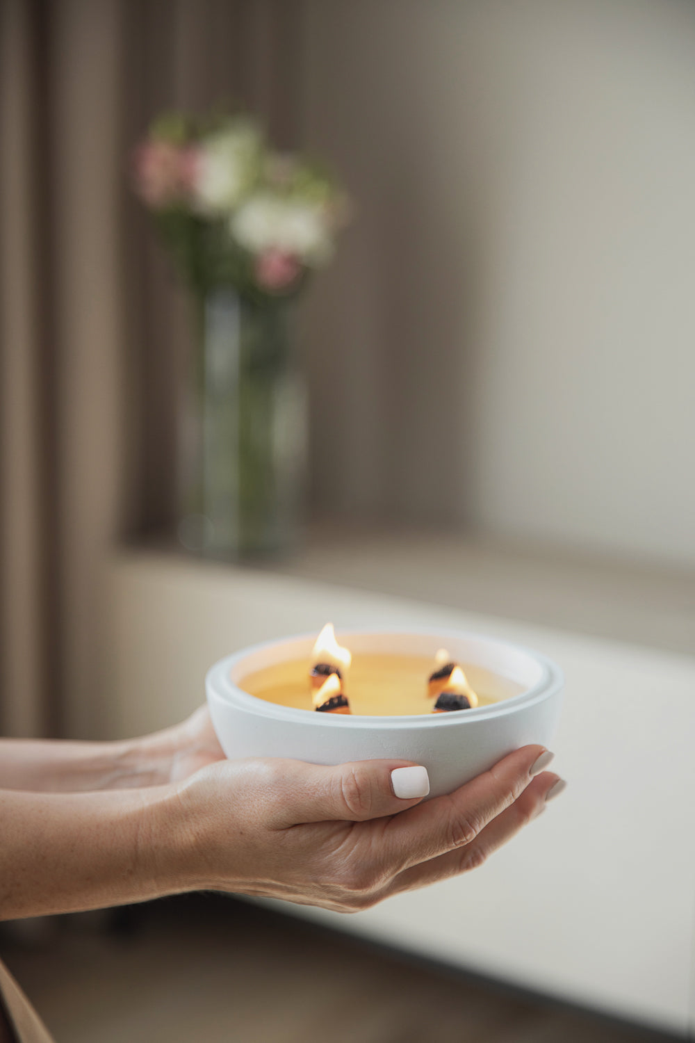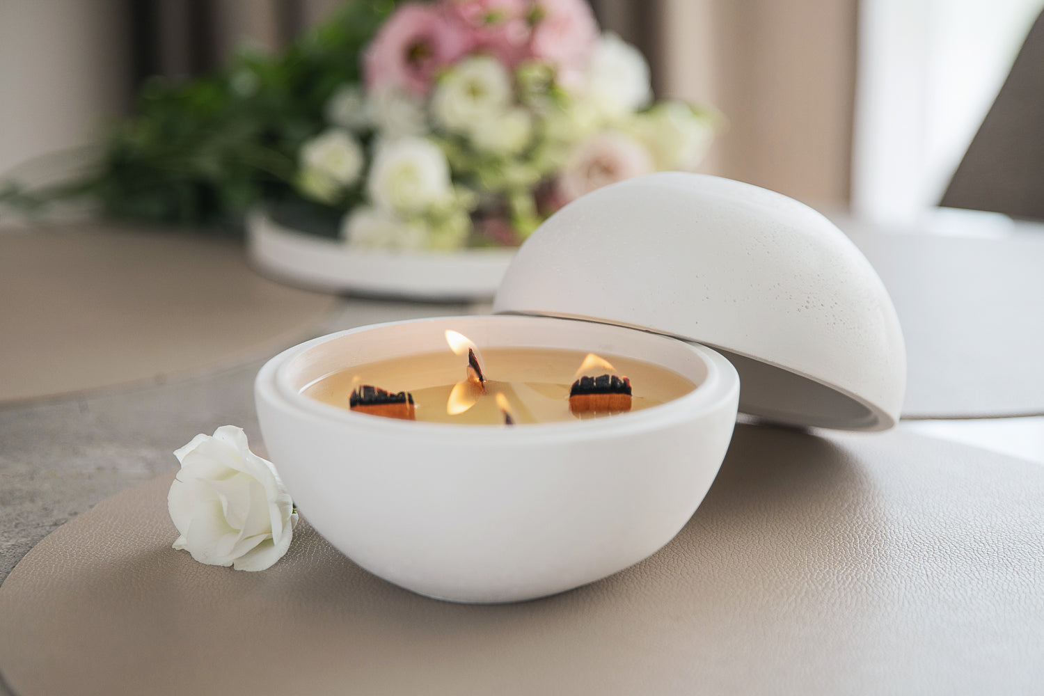 This unique candle not only brings warmth and coziness but also serves as a stylish home décor piece. Poured into a white gypsum spherical jar, the candle is made from natural coconut wax and features 4 wooden wicks that create a gentle crackling sound while burning.